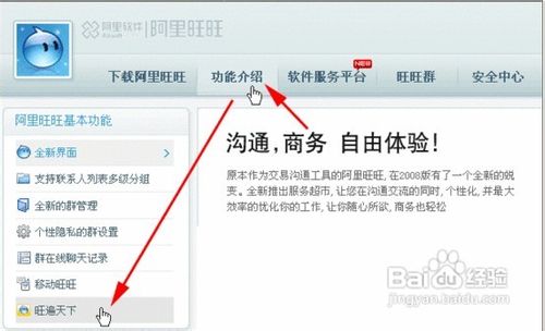 首先进入阿里旺旺的官方首页,在“功能介绍”栏目中,找到“旺遍天下”按钮