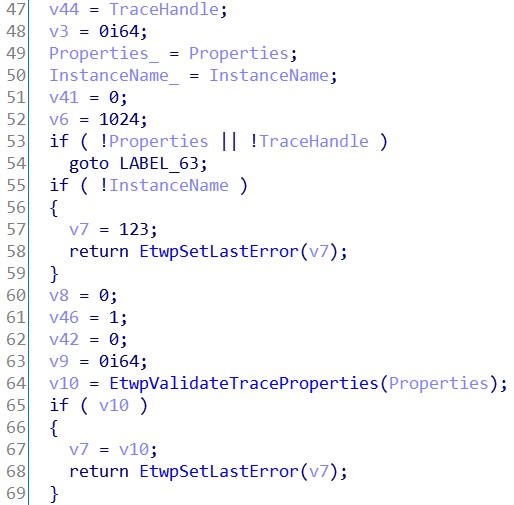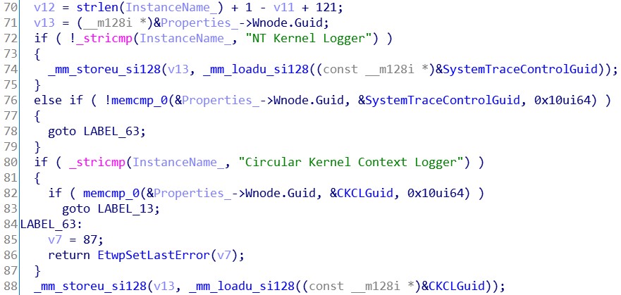 所以我们将 Advapi32.dll 文件用IDA打开,下载 dll 的符号文件让 IDA 自动分析。分析完成后,转到 StartTraceA 函数,从函数头部开始看。首先是对参数的合法性检查。接着是对参数2的 InstanceName 字符串内容进行比较。如果为“NT Kernel Logger”,则将 SystemTraceControlGuid 的 Guid 赋值给 Properties->Wnode.Guid。如果为“Circular Kernel Context Logger”, 则将 CKCLGuid 的 Guid 赋值给 Properties->Wnode.Guid。我们看下这个 CKCLGuid 的内容,之后会用到。首先判断“Properties->LogFileNameOffset”如果小于等于0,则跳到 LABEL_67 标签。在图片底部可以看到 LABEL_67 标签置零了2个变量,但并没有返回退出。说明这个函数允许 LogFileNameOffset 的值为0。同样,我们在 msdn 查阅一下这个结构体:https://docs.microsoft.com/en-us/windows/win32/etw/event-trace-properties找到对这个成员的描述,截取关键内容下来:LogFileNameOffset
