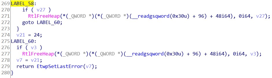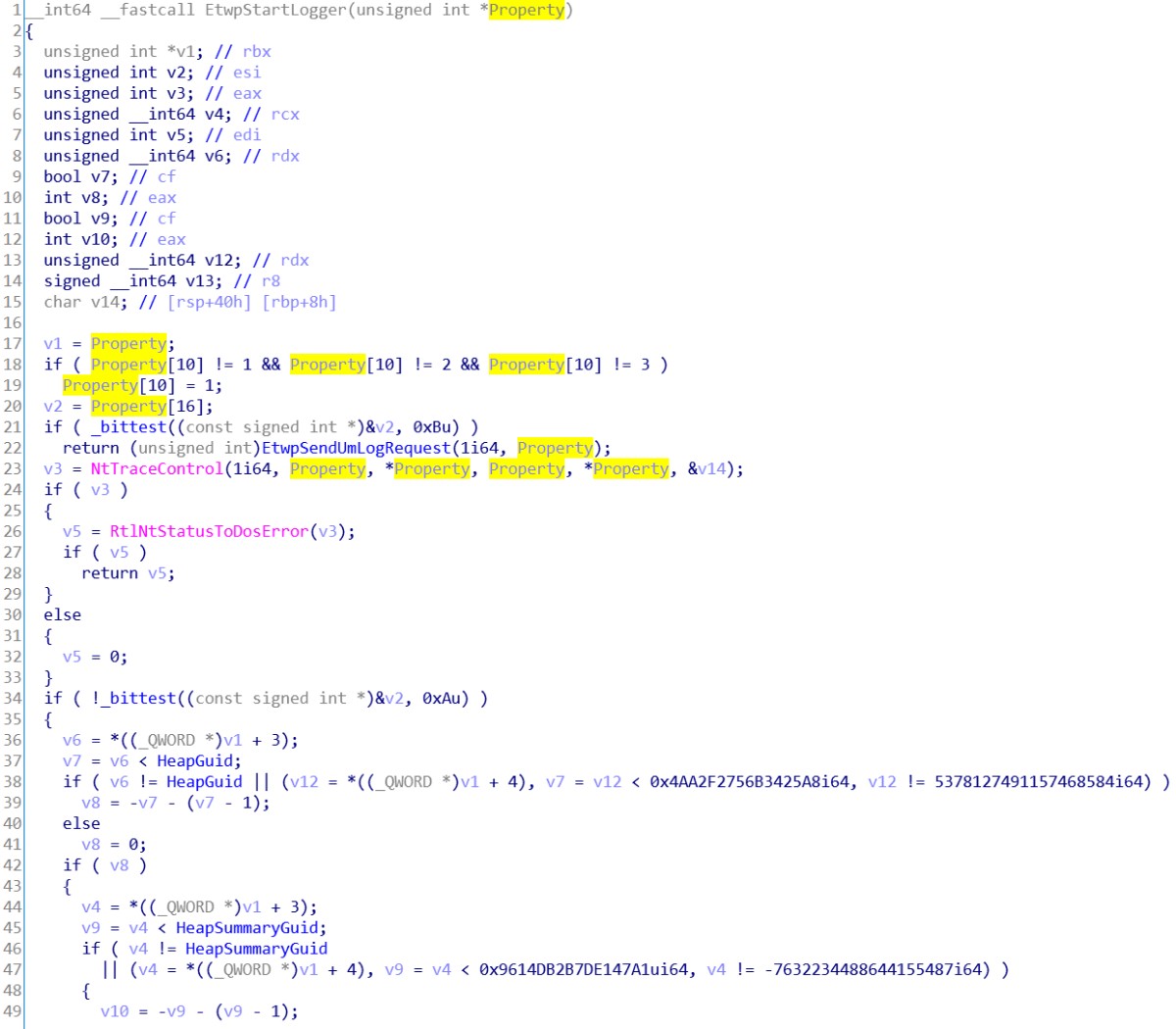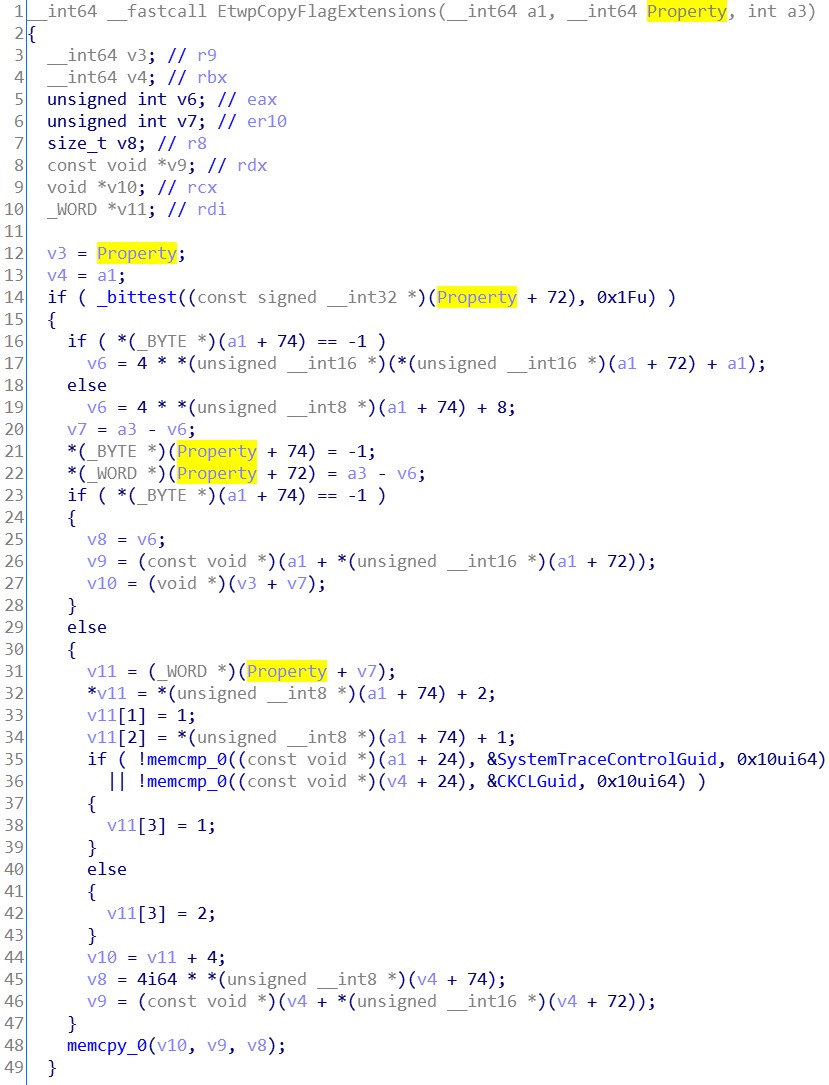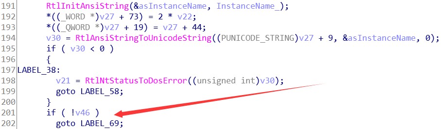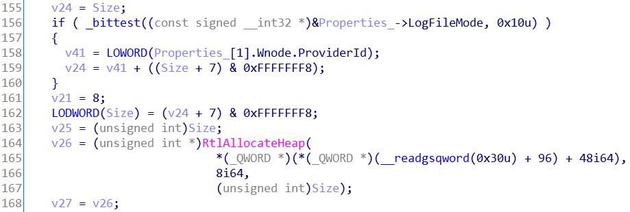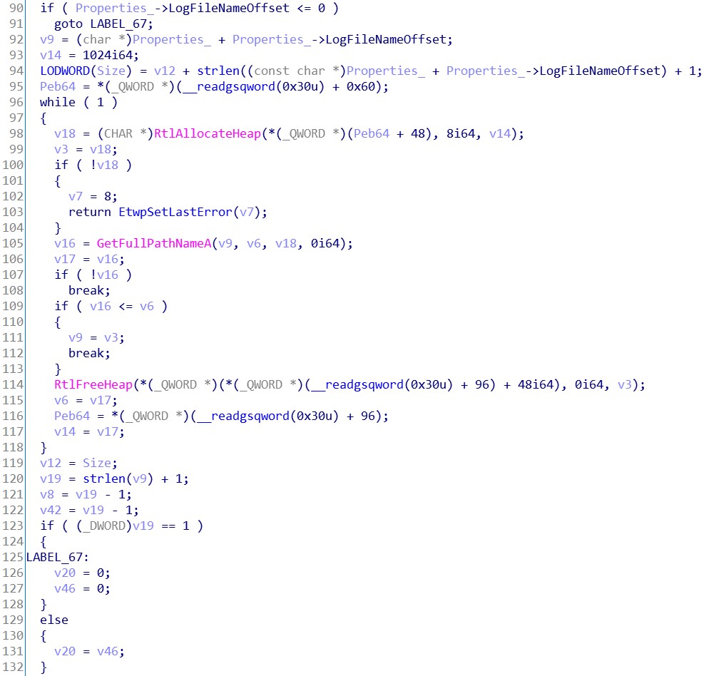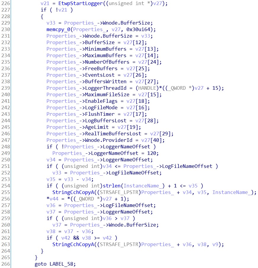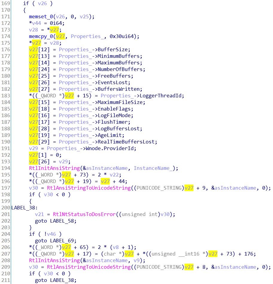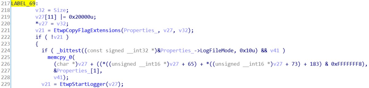 我们可以得知, 日志文件是用于调试应用程序或定位性能问题位置的。而 InfinityHook 并不需要这些东西。所以 LogFileNameOffset 成员可以直接置0,跳过这段继续往下分析。接着是一些参数标志合法性检查,这些合法性检查由 Etwp 开头的 API 完成。假定我们传递的所有参数都是正确的,所以无需跟进这些 API 进行分析。从堆中分配一块内存空间,后面要用到。将我们传递进来的 Properties 参数填进v27变量内。接着我们可以看到几个字符串操作 API 。还记得刚刚在 msdn 提到的关注点吗?应该就是这里了。第一个字符串的处理是将我们传递进来的 InstanceName 参数初始化为一个 ANSI_STRING 字符串。再将其转换为一个 UNICODE_STRING 字符串。转换完的 UNICODE_STRING 字符串存放在 (PUNICODE_STRING)v27 + 9 的位置。UNICODE_STRING 结构体的大小为16,故步长为16。实际存放地址是在 v27 + 144 。再看下 EVENT_TRACE_PROPERTIES 结构体的大小为120。说明这个 UNICODE_STRING 字符串存放在 v27 + sizeof(EVENT_TRACE_PROPERTIES) + 24 的位置。处理完第一个字符串后有一个判断,如果 v46 等于0,则跳到 LABEL_69 标签。而这个 v46 就是刚刚判断 LogFileNameOffset 如果等于0所置零的变量。所以这里可以跳过第二个字符串的处理,直接往下看。看到了两个 Etwp 开头的API,我们先跟进第一个 API 看看。不难看出,这个 API 对 Property 的内容影响并不大,只有两处,74和72偏移。对比结构体定义发现,是在对 EnableFlags 成员填值。这个成员放到后面再讲,所以这里先暂时跳过此 API。接着来看 EtwpStartLogger 这个API。可以很直观的看到,检查了一些成员后调用了 NtTraceControl 这个 API。这个就是我们在 Ring0 层启动事件跟踪会话的API了。在这 API 之下是一些与结构体内容无关的操作。所以直接跳过,返回上层继续看。将堆内存的 Property 内容,置回到参数 Property 中。然后跳到 LABEL_58 标签。释放堆内存,返回成功与否。至此,StartTraceA 这个 API 逆向完成。我们知道了部分参数的填写规则和关键 API。下一步我们开始写 InfinityHook 的实现代码。0x03.2 InfinityHook 的实现