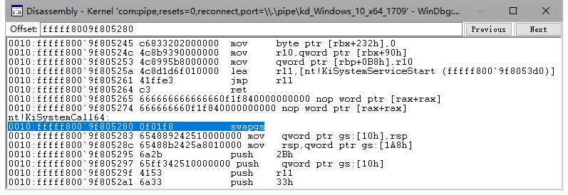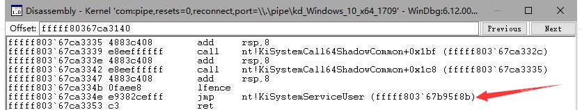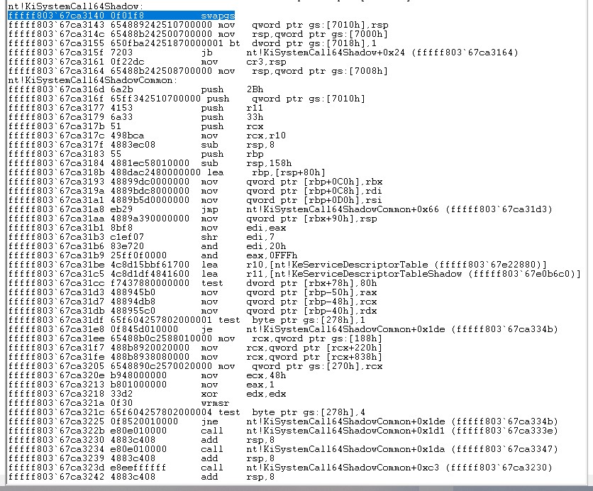 这是没打补丁通过 msr 取到的 SyscallEntry,函数名是 KiSystemCall64。这是打了 KB4056892 补丁后通过 msr 取到的 SyscallEntry,可以看到函数名是 KiSystemCall64Shadow。在函数尾部有一个 jmp,跳到了真正的入口 KiSystemServiceUser,而这个真正的入口一定是在 KVASCODE 区段外。所以我们利用 HDE 反汇编引擎,对影子入口的每条指令进行解析,找到一条跳出 KVASCODE 区段的 jmp 指令。
