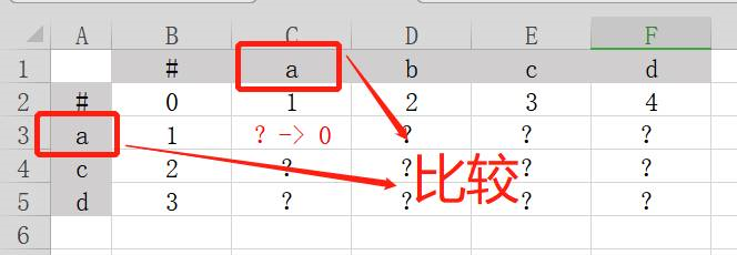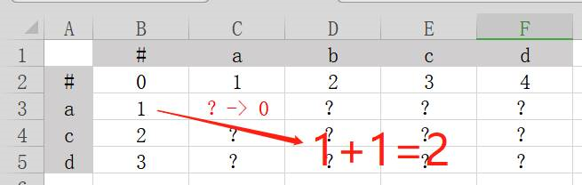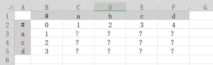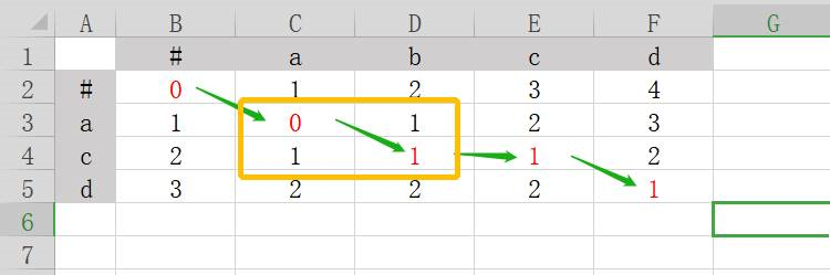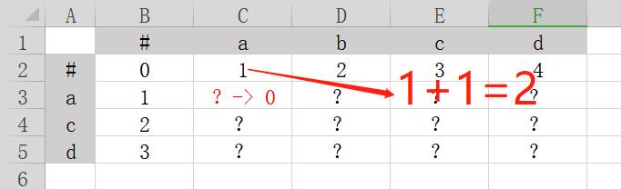 在上图的表格中,横列坐标是字符串abcd,纵列坐标是字符串acd。我们需要在标有问号的区域填写数字,把整张表填满。填表规则如下: