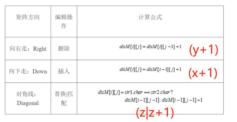 3、取(?)所在格子向左上一个格子的数值z。比较上图中,格子所对应的,灰色区域中的字符是否相等。如相等,则不需要任何操作,记作z。如不相等,则把数值z加1,记作z+1。整体记作(z|z+1)。