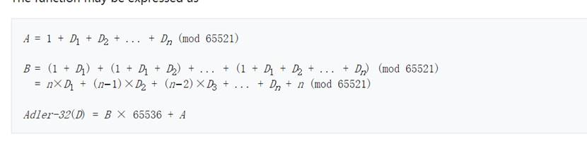 上图为整个Adler32算法的计算步骤,图中D为具体的原始输入数据,n为数据的长度。
