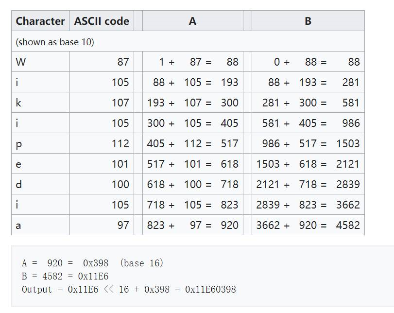 上图是把Wikipedia字符串计算成Adler32 Hash的计算过程。