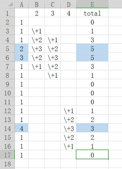 2、在数组A中,对A中每一个位置上的数据进行比对,发现其为(2、3、4)的时候,则在B中相同的位置上+3,与这个位置相邻1的位置+2,与这个位置相邻2的位置+1。B:(0、+1、+2、+3、+2、+1、0、0、0、0、0、0、0、0、0、0)