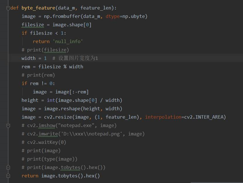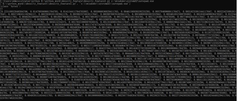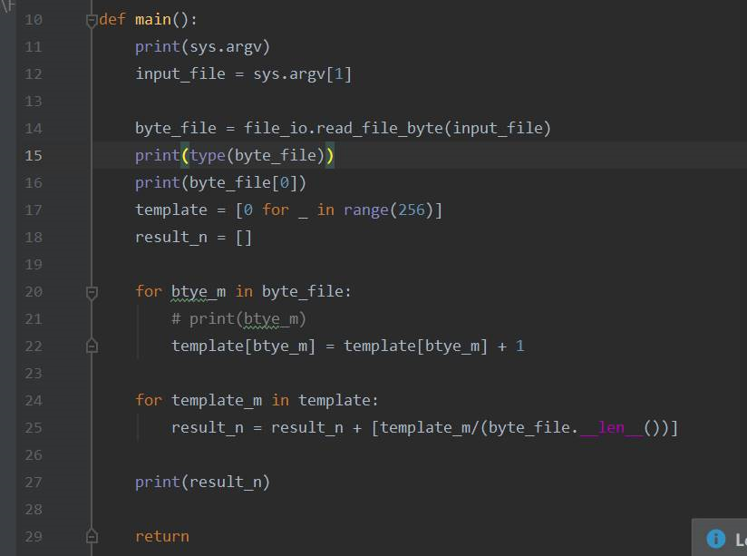 整个python代码如上图,图片中第一个for循环,是在对256个状态中的每个状态进行计数,比如样本文件中出现了66,就在template数组中66下标处累加1。第二个for循环是对template中的每一个数据除以样本的size(单位bytes),目的是为了得到256个状态中的每一个状态,在样本中出现的频率。
