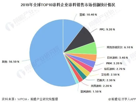 根据WPCIA数据显示,2019年,全球涂料销售排名前十涂料公司分别为:宣威(179.5亿美元)、PPG(158.2亿美元)、阿克苏诺贝尔(105.2亿美元)、日本涂料(59.44亿美元)、PRM(55.64亿美元)、钻石涂料(45.88亿美元)、艾仕得(43.03亿美元)、巴斯夫(40.22亿美元)、关西涂料(38.56亿美元)、亚洲涂料(26.24亿美元)。