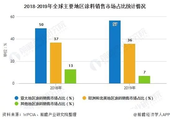亚太地区的制造业体量大,且在劳动力和原材料方面存在相对优势,大型涂料产商在亚太地区投建了工厂,同时涂料下游建筑业及汽车行业市场需求增长强劲。2019年亚太地区涂料销售市场占全球的57%,相对2018年市场份额上升了7个百分点,而欧洲和北美市场份额总和则下降至36%。