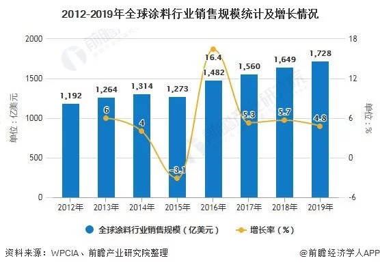 根据世界油漆与涂料工业协会(WPCIA)数据显示,除2015年外,2012-2019年全球涂料市场整体增长趋势。2019年,全球涂料市场销售额为1728亿美元,同比增长4.8%。