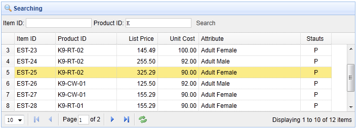 <table id="tt" class="easyui-datagrid" style="width:600px;height:250px" url="datagrid24_getdata.php" toolbar="#tb" title="Load Data" iconCls="icon-save" rownumbers="true" pagination="true"> <thead> <tr> <th field="itemid" width="80">Item ID</th> <th field="productid" width="80">Product ID</th> <th field="listprice" width="80" align="right">List Price</th> <th field="unitcost" width="80" align="right">Unit Cost</th> <th field="attr1" width="150">Attribute</th> <th field="status" width="60" align="center">Stauts</th> </tr> </thead> </table>