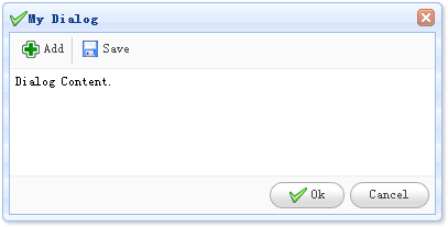 <div id="dlg-toolbar"> <a href="#" class="easyui-linkbutton" iconCls="icon-add" plain="true" onclick="javascript:alert('Add')">Add</a> <a href="#" class="easyui-linkbutton" iconCls="icon-save" plain="true" onclick="javascript:alert('Save')">Save</a> </div> <div id="dlg-buttons"> <a href="#" class="easyui-linkbutton" iconCls="icon-ok" onclick="javascript:alert('Ok')">Ok</a> <a href="#" class="easyui-linkbutton" iconCls="icon-cancel" onclick="javascript:$('#dd').dialog('close')">Cancel</a> </div>上面的代码我们创建了一个带有工具栏(toolbar)和按钮(button)的对话框(dialog)。这是对话框(dialog)、工具栏(toolbar)、内容(content)和按钮(buttons)的标准配置。